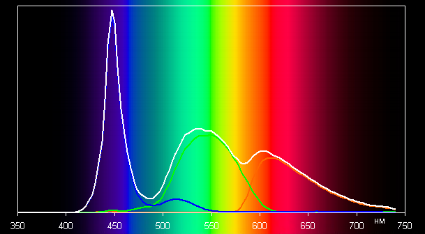 Такой спектр с относительно узким пиком синего и с широкими горбами зеленого и красного цветов характерен для экранов, в которых используется белая светодиодная подсветка с синим излучателем и желтым люминофором.