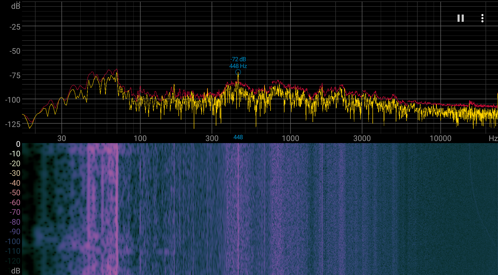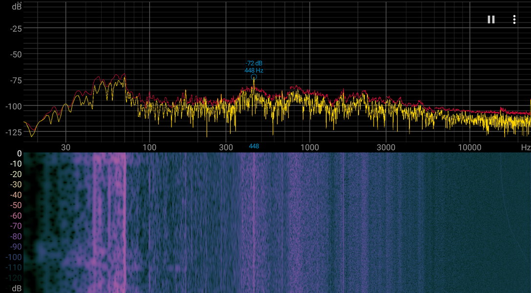 Если моноблок не нагружать совсем, то его система охлаждения в указанных выше условиях может работать в пассивном режиме. Даже при большой нагрузке на процессор шум от системы охлаждения невысокий. Характер шума довольно ровный и раздражения не вызывает. Спектрограмма это подтверждает: в среднечастотной области пики есть, но интенсивность их невысокая.