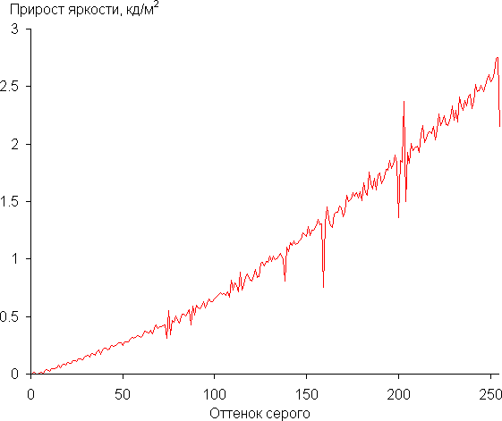 Далее мы измерили яркость 256 оттенков серого (от 0, 0, 0 до 255, 255, 255). График ниже показывает прирост (не абсолютное значение!) яркости между соседними полутонами:
