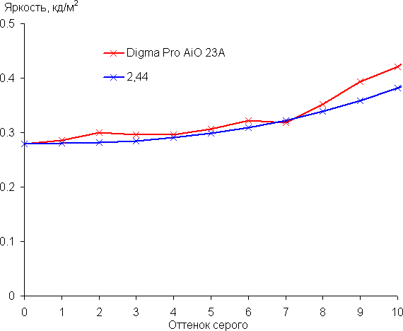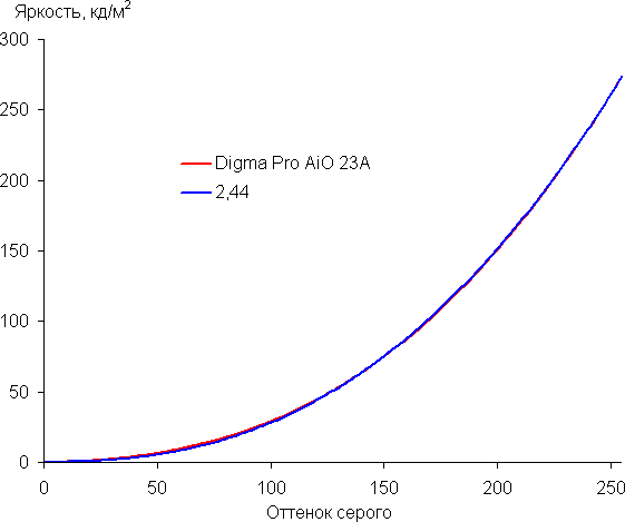 Аппроксимация полученной гамма-кривой дала показатель 2,44, что выше стандартного значения 2,2, поэтому изображение немного затемнено. При этом реальная гамма-кривая мало отклоняется от аппроксимирующей степенной функции: