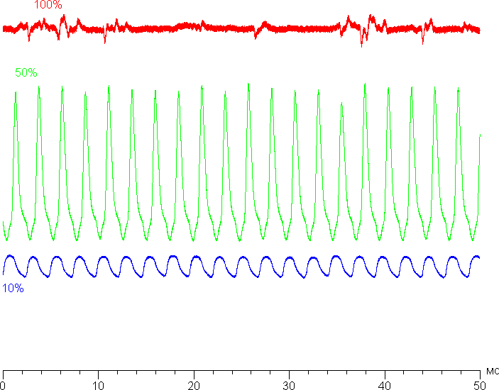 На уровне яркости ниже максимума есть значимая модуляция подсветки, но ее относительно высокая частота (410 Гц) и не очень большая амплитуда обуславливает отсутствие видимого глазом мерцания. В доказательство приведем графики зависимости яркости (вертикальная ось) от времени (горизонтальная ось) при различных значениях яркости: