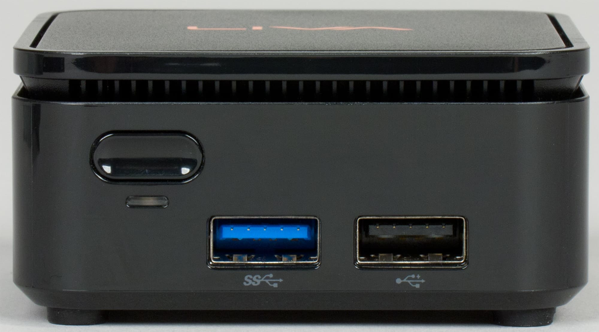 Если не обращать внимание на габариты и ни с чем их не сравнивать, а просто смотреть на фотографии, сначала кажется, что Liva Q выглядит как традиционный мини-ПК. Но буквально через несколько секунд взгляд «цепляется» за расположенную спереди пару USB-портов, так что «не сравнивать» — не получается. Хорошо видно, что больше двух портов на «мордочке» этой крохи и не поместится. Разве что можно оставить «традиционный» USB 2.0, поместив рядом пару Type-C — так влезет. И возможно, в следующих моделях так и будет сделано. С другой стороны, пока периферии под Type-C не слишком много (мягко говоря), так что (опять же, пока) большинству пользователей больше подойдет пара портов Type-А. В любом случае, два порта (USB 2.0 + USB 3.0) — это лучше, чем на стиках, но хуже, чем у более крупных мини-ПК. У самой первой Liva было столько же.