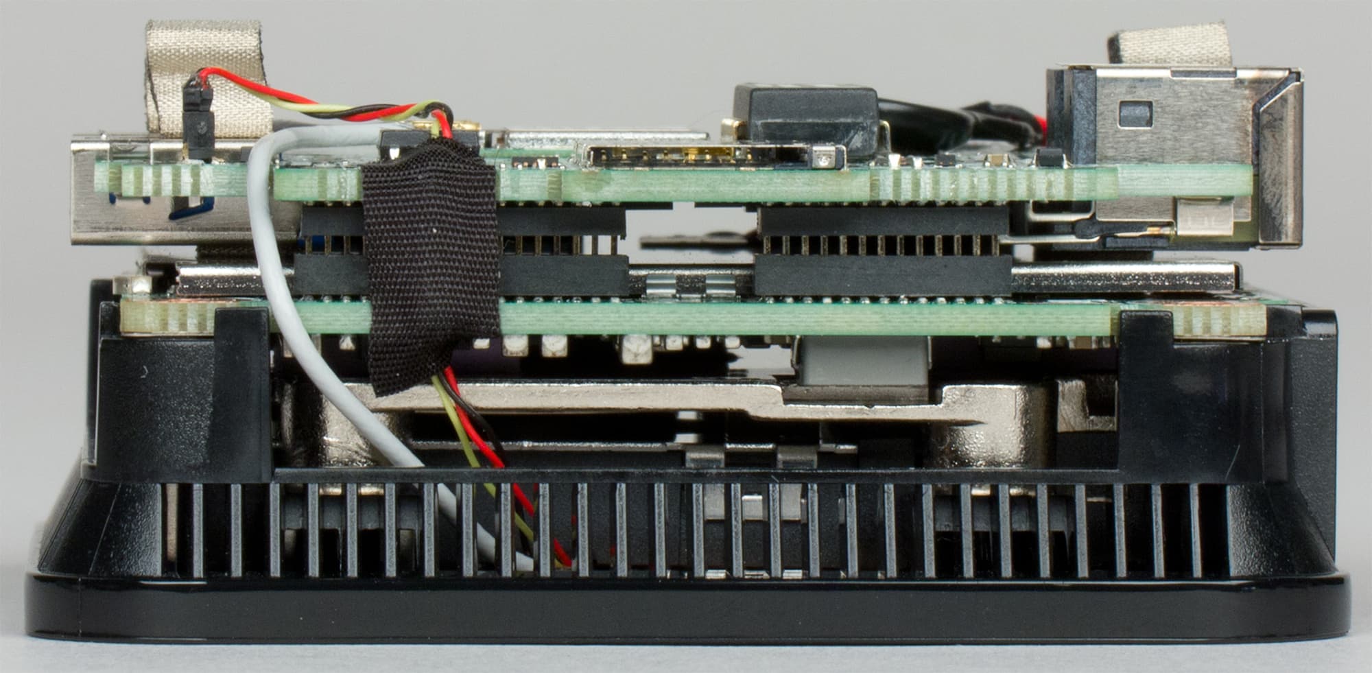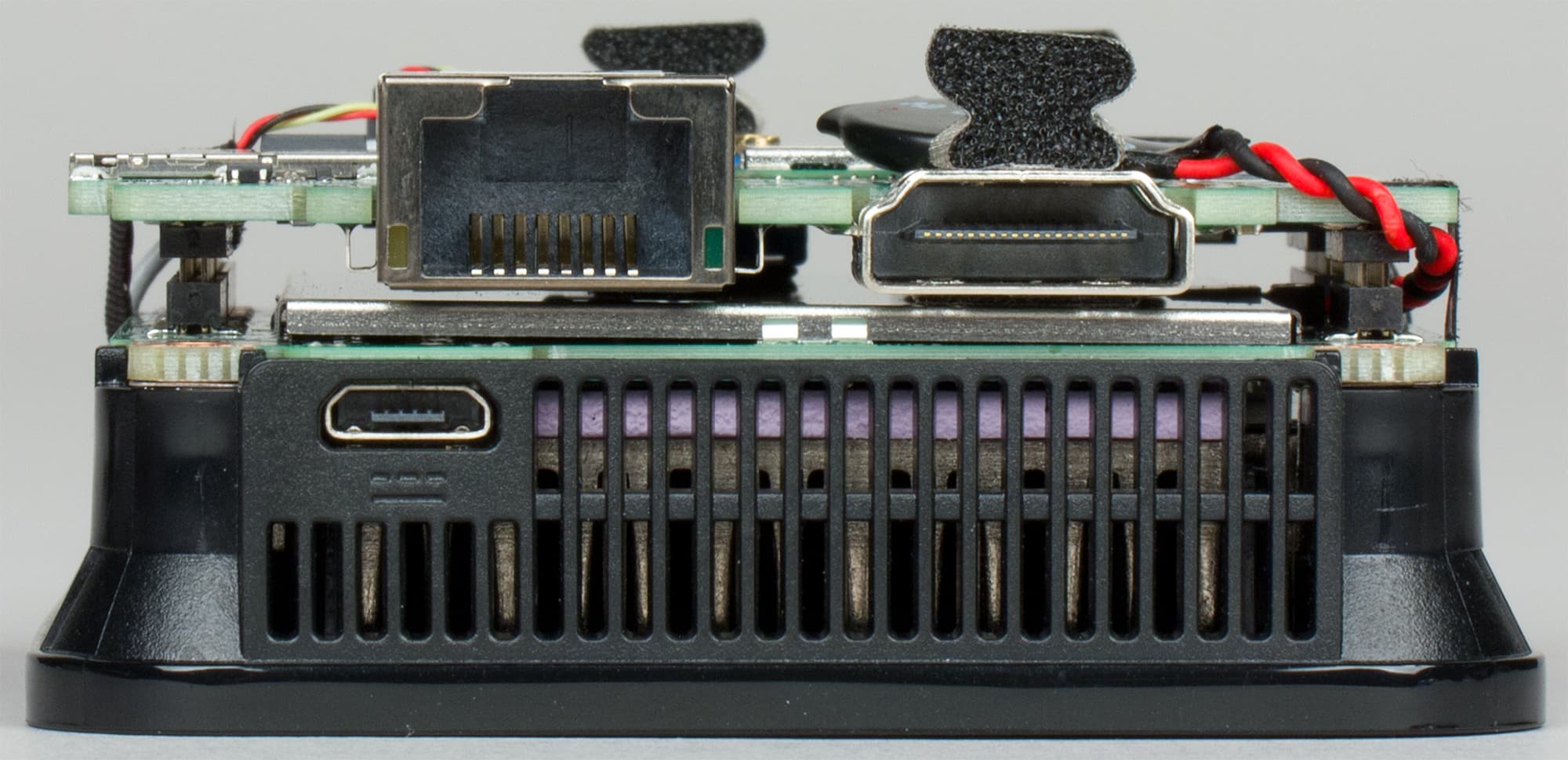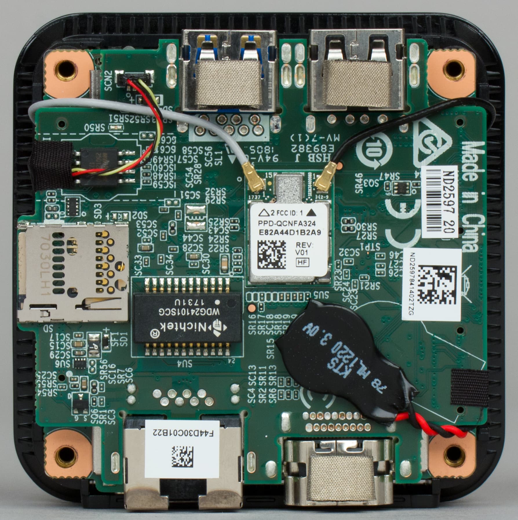 Остальное содержимое заднего торца даже немного превосходит ожидания: кроме разъема гигабитной сети (что естественно), нашелся и видеовыход — один, но HDMI 2.0. Непосредственно SoC он не поддерживается, но на мост DisplayPort—HDMI в моделях на четырехъядерных процессорах компания не поскупилась — за что ей спасибо.