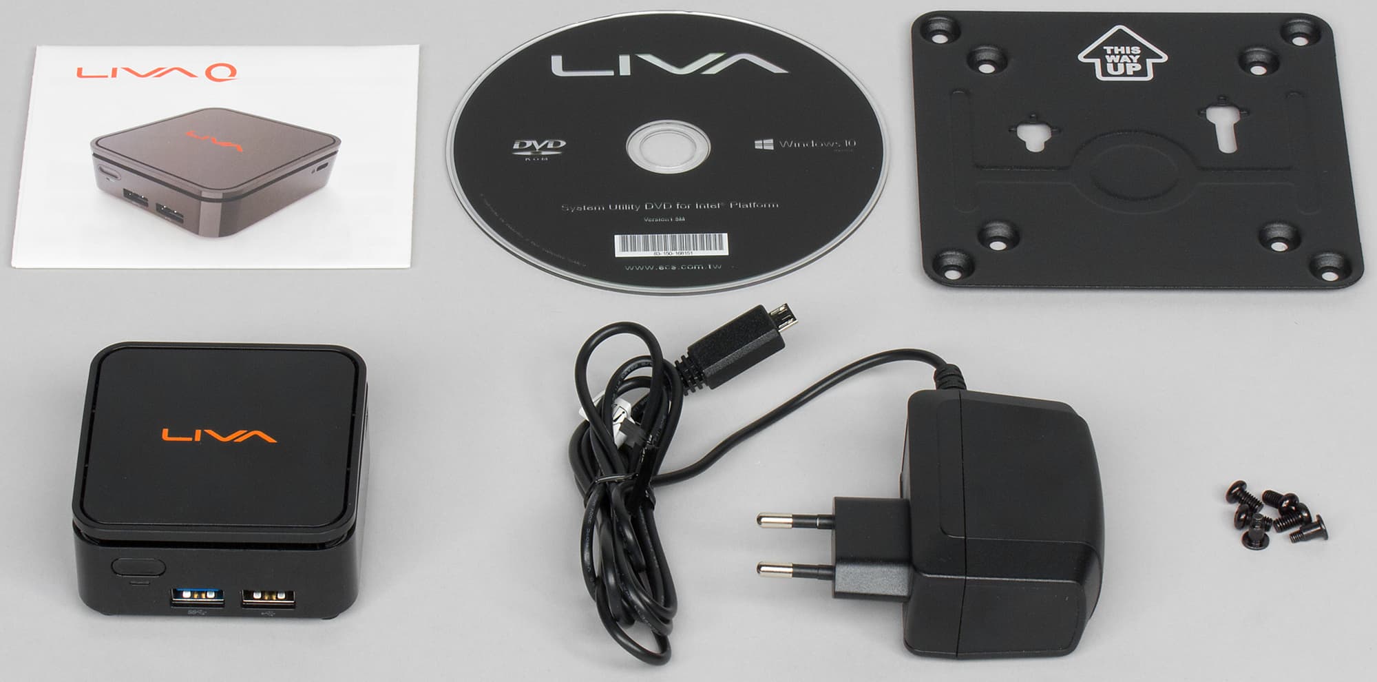 Таковой в общих чертах не меняется еще с момента выпуска первой Liva. Кроме собственно компьютера комплект включает БП, краткую бумажную инструкцию, VESA-крепление и DVD-диск с драйверами. Особенно трогательно выглядит, конечно, последний — в 2018 году и вместе с ПК такого размера, к которому уж точно никто не будет подключать соответствующий привод :)