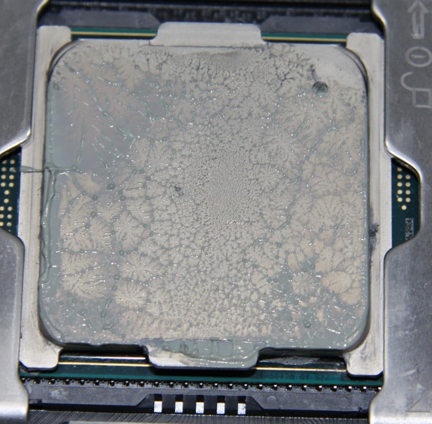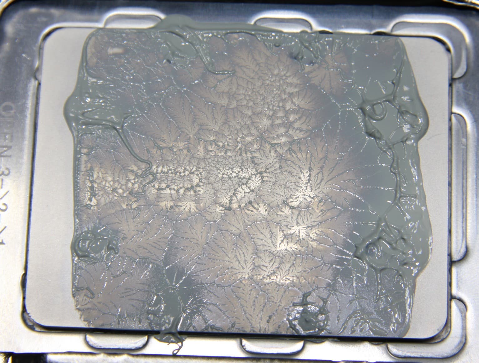 Видно, что термопаста распределилась очень тонким слоем на большей части площади крышки процессора, а ее избытки выдавились за края.