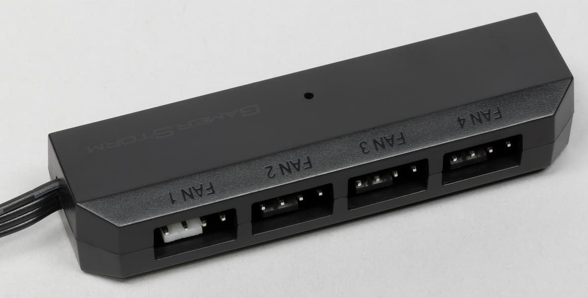 Длина кабеля питания вентилятора составляет 29 см. Разветвитель питания вентиляторов представляет собой небольшую коробочку из черного пластика. Ее можно закрепить в корпусе ПК, использовав полоску с клейким слоем снизу. Длина кабеля, которым разветвитель подключается, например, к разъему для вентиляторов на материнской плате, равна 39 см.