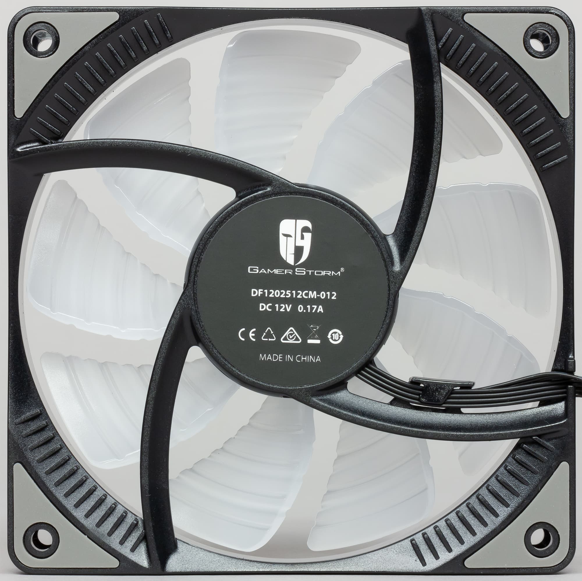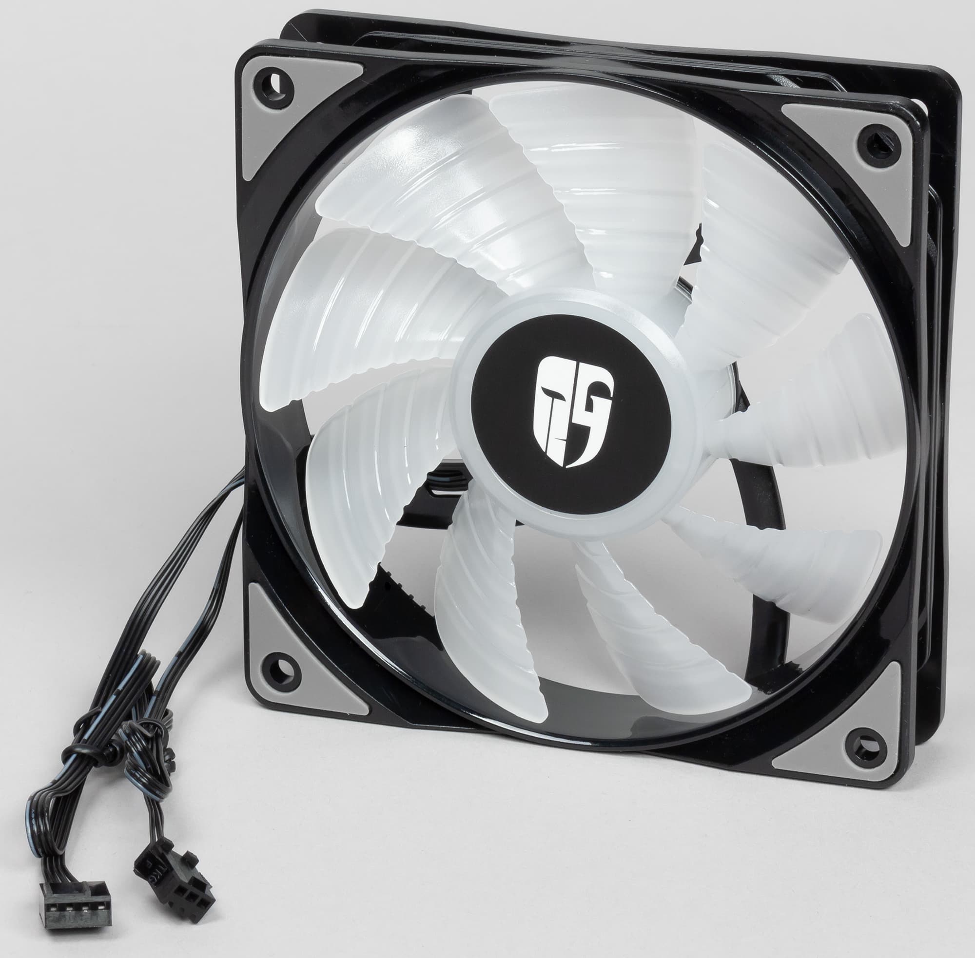 Вентилятор имеет четырехконтактный разъем (общий, питание, датчик вращения и управление ШИМ) на конце кабеля. Провода от вентилятора просто плоские, что очень удобно. Крыльчатка вентилятора изготовлена из белого полупрозрачного пластика. На статоре вентилятора размещены RGB-светодиоды, которые подсвечивают крыльчатку изнутри. На подсветку идет отдельный кабель с трехконтактным разъемом. Длина кабеля подсветки 40 см.