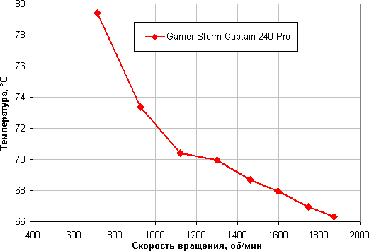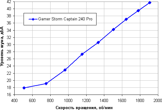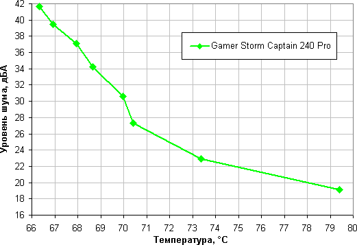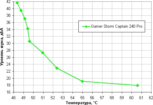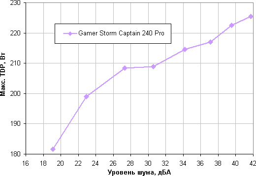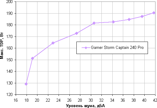 Приняв 25 дБА за критерий условной бесшумности, получим примерную максимальную мощность процессоров, соответствующих этому уровню, это порядка 170 Вт. Гипотетически, если не обращать внимания на уровень шума, пределы мощности можно увеличить еще где-то до 190 Вт. Еще раз уточним, это в жестких условиях обдува радиатора нагретым до 44 градусов воздухом, при снижении температуры воздуха указанные пределы мощности для бесшумной работы и максимальной мощности возрастают. В целом система Gamer Storm Captain 240 Pro является типичной по производительности в своем классе (с радиатором на два вентилятора 120 мм).