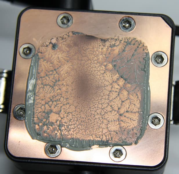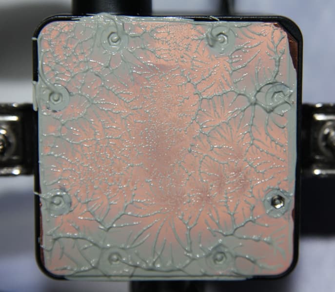 Дополнительные тесты были проведены с использованием процессора AMD Ryzen Threadripper 2990WX. В этом случае, так как площадь крышки процессора существенно больше площади теплосъемника водоблока, то термопаста наносилась на теплосъемник. Распределение термопасты после завершения на процессоре: