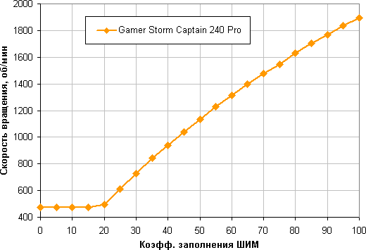 Диапазон регулировки скорости вращения довольно широкий, есть плавный близкий к линейному рост скорости вращения при изменении коэффициента заполнения (КЗ) от 20% до 100%. Отметим, что при КЗ 0% вентиляторы не останавливаются, что может иметь значение в гибридной системе охлаждения с пассивным режимом на минимальной нагрузке.