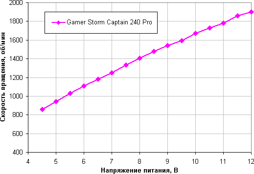 Изменение скорости вращения также плавное, но диапазон регулировки с помощью напряжения более узкий. Вентиляторы останавливаются при 4,2/4,3 В, а при 4,3/4,4 В запускаются. Видимо, в случае необходимости их допустимо подключать к 5 В.