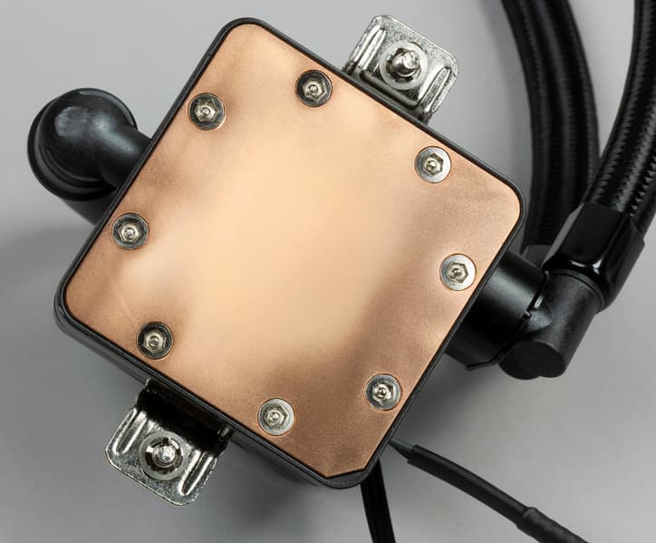 Система герметичная, заправлена, готова к использованию. Помпа интегрирована в один блок с теплосъемником. Подошвой теплосъемника, непосредственно прилегающей к крышке процессора, служит медная пластина. Ее внешняя плоскость шлифованная и полированная до матовой поверхности. Подошва почти идеально плоская, только к центру она едва заметно выпуклая с перепадом от краев порядка 0,1 мм.
