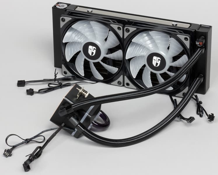 Внутри коробки находятся радиатор с подключенной помпой, вентиляторы, комплект крепежа, разветвители для подсветки и для питания вентиляторов, переходники, удлинитель, инструкция, контроллер подсветки и термопаста в шприце.