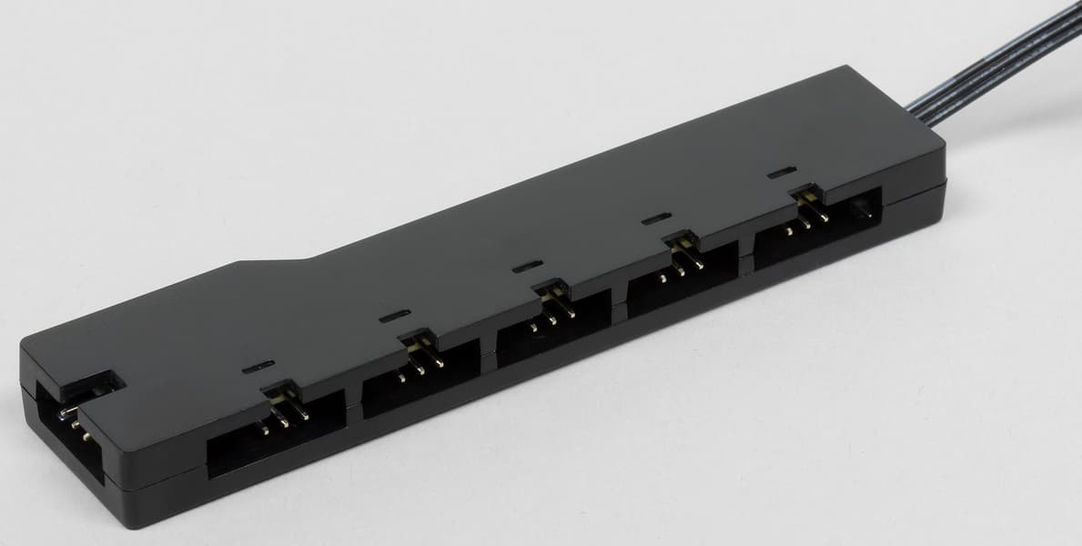 Если на материнской плате или на другом контроллере подсветки есть стандартный трехконтактный разъем для подключения ARGB-подсветки, то контроллер из комплекта можно не использовать, подключив подсветку вентиляторов и помпы через разветвитель (на 6 разъемов) и кабель-переходник.