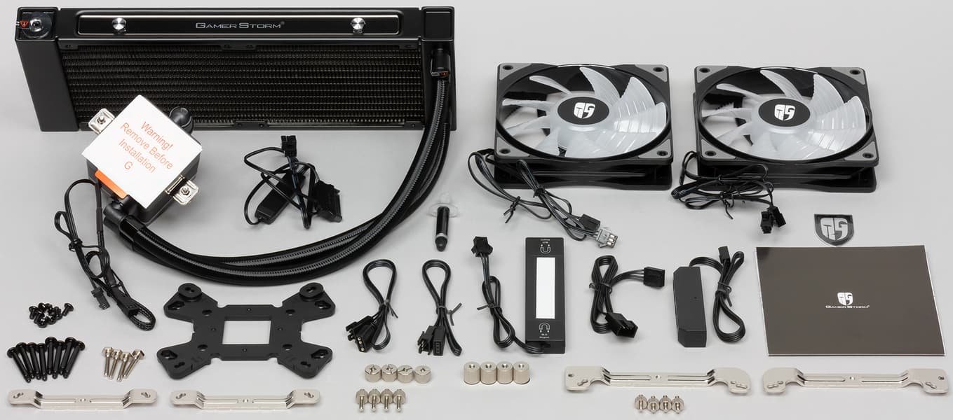 Поставляется система жидкостного охлаждения Gamer Storm Captain 240 Pro в коробке из среднего по толщине гофрированного картона. На внешних плоскостях коробки в цвете изображен сам продукт, а также перечислены основные особенности и технические характеристики. Все надписи только на английском языке. Для защиты и распределения деталей используются форма из папье-маше, картонная коробка и кожухи, а также прокладка из вспененного полиэтилена и пластиковые пакеты. Детали крепежа расфасованы по группам в пакеты с подписями-наклейками, что очень удобно.