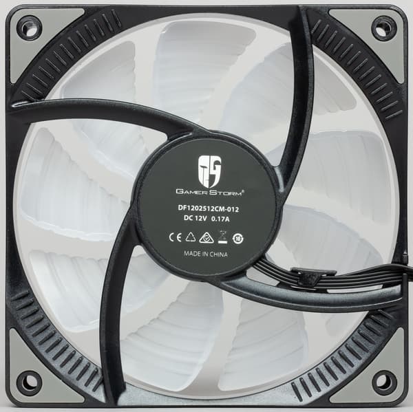 Типоразмер комплектных вентиляторов 120 мм. Масса вентилятора с кабелями 141 г. На проушины рамки вентилятора наклеены накладки из резины. Эти упругие элементы по идее должны снижать шум от вибрации, но на практике ничего этого не будет, так как масса вентилятора и жесткость виброгасящих элементов позволяют обоснованно предположить, что из-за высокой резонансной частоты эта система в любом случае не будет иметь сколько-либо значимых антивибрационных свойств. К тому же крепежные винты обязательно будут касаться жесткой рамки (для предотвращения этого ничего не сделано), а не только накладки. Но хотя бы исключен вариант дребезга из-за неплотного прилегания.