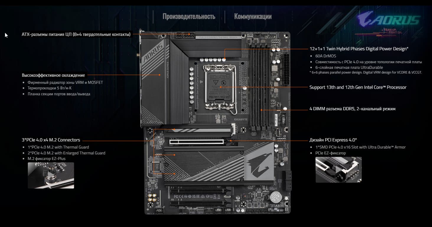 12е и 13е поколения процессоров добавляют к этому набору еще 20 линий PCIe, при этом 16 линий (расходуемые на слоты PCIe x16) версии PCIe 5.0, оставшиеся 4 линии PCIe 4.0 идут на М.2 слот. Процессоры 12ххх/13ххх умеют поддерживать как DDR5, так и DDR4, так что производители матплат вольны выпускать продукты как с DDR5, так и с DDR4 слотами. Забегая вперед, замечу, что у данной материнской платы версия PCIe для видеокарт на первом слоте понижена до 4.0.