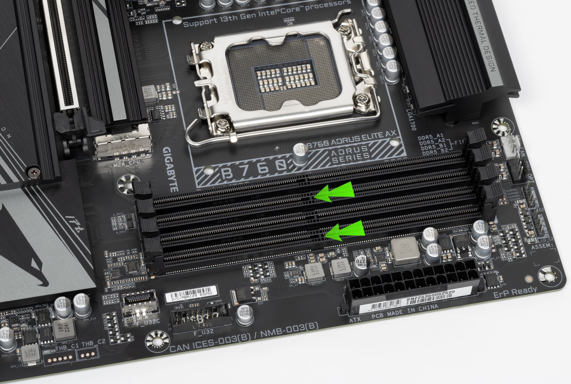 Для установки модулей памяти на плате Gigabyte имеется четыре DIMM-слота (для работы памяти в Dual Channel в случае использования всего 2 модулей их следует устанавливать в А2 и B2.