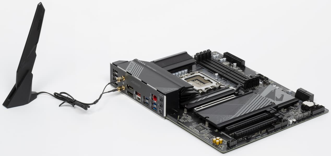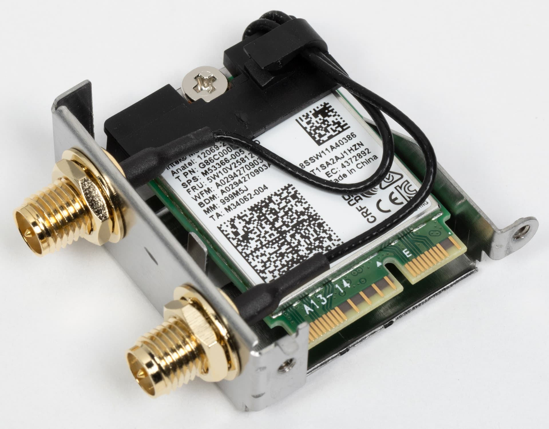 Имеется и комплексный беспроводной адаптер на контроллере Intel AX211NGW, через который реализованы Wi-Fi 6E (802.11a/b/g/n/ac/ax) и Bluetooth 5.2. Он установлен в слот M.2 (E-key), и его разъемы для привинчивания выносных антенн выведены на заднюю панель.