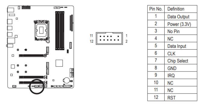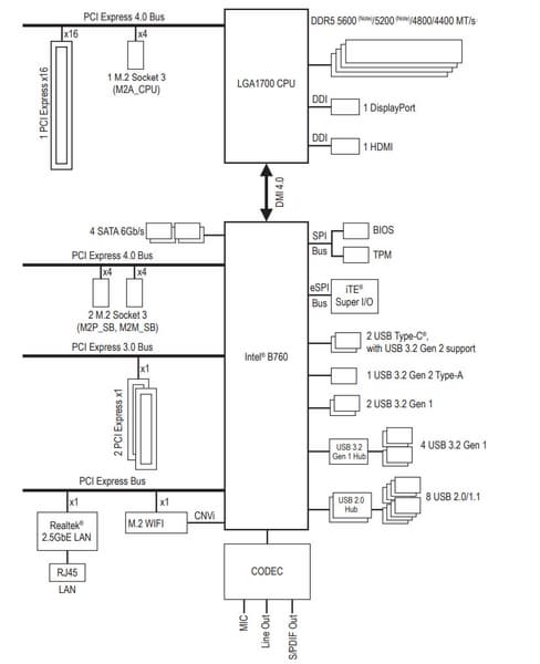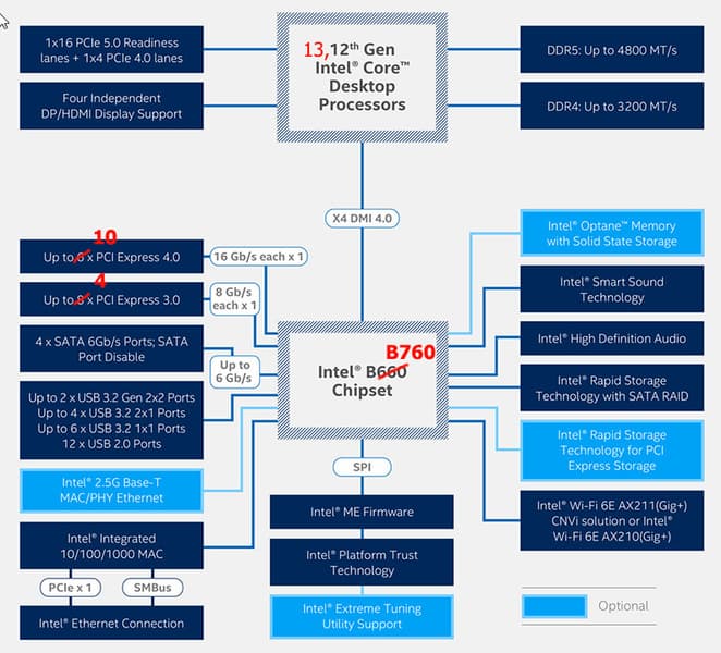 Процессоры Intel Core 12-го и 13-го поколения (совместимые с сокетом LGA1700 и поддерживаемые B660/760) имеют 20 линий ввода-вывода (16 PCIe 5.0, 4 PCIe 4.0), не имеют USB и SATA портов. При этом взаимодействие с B760 идет по особому каналу Digital Media Interface 4.0 (DMI 4.0 x4 (именно х4!)). Все PCIe линии процессора идут на слоты расширения PCIe и порт М.2. Serial Peripheral Interface (SPI) используется для взаимодействия с системой UEFI/BIOS, а шина Low Pin Count (LPC) — для связи с устройствами ввода/вывода, не требующими высокой пропускной способности (контроллерами вентиляторов, TPM, старой периферии).