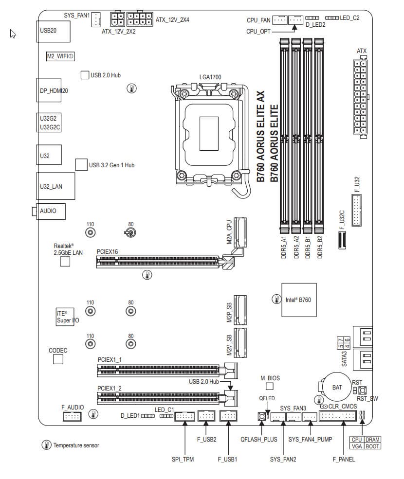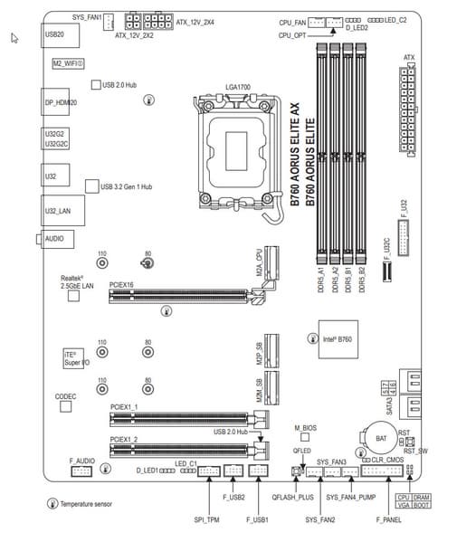 Форм-фактор ATX имеет размеры до 305×244 мм, а E-ATX — до 305×330 мм. Материнская плата Gigabyte B760 Aorus Elite AX имеет размеры 305×244 мм, поэтому выполнена в форм-факторе ATX, и на ней имеются 9 монтажных отверстий для установки в корпус.