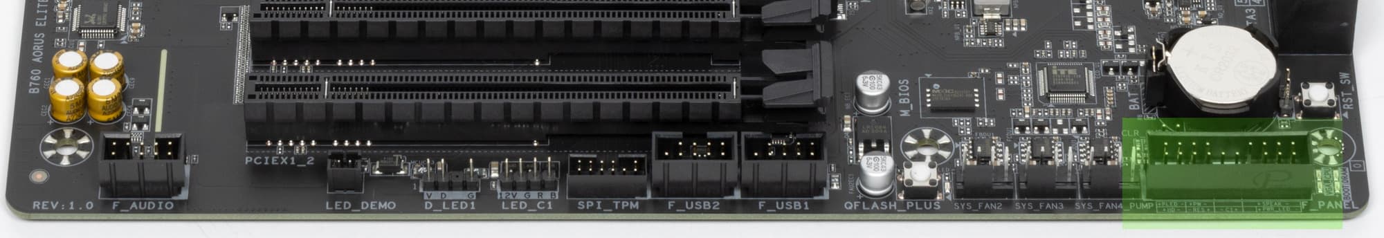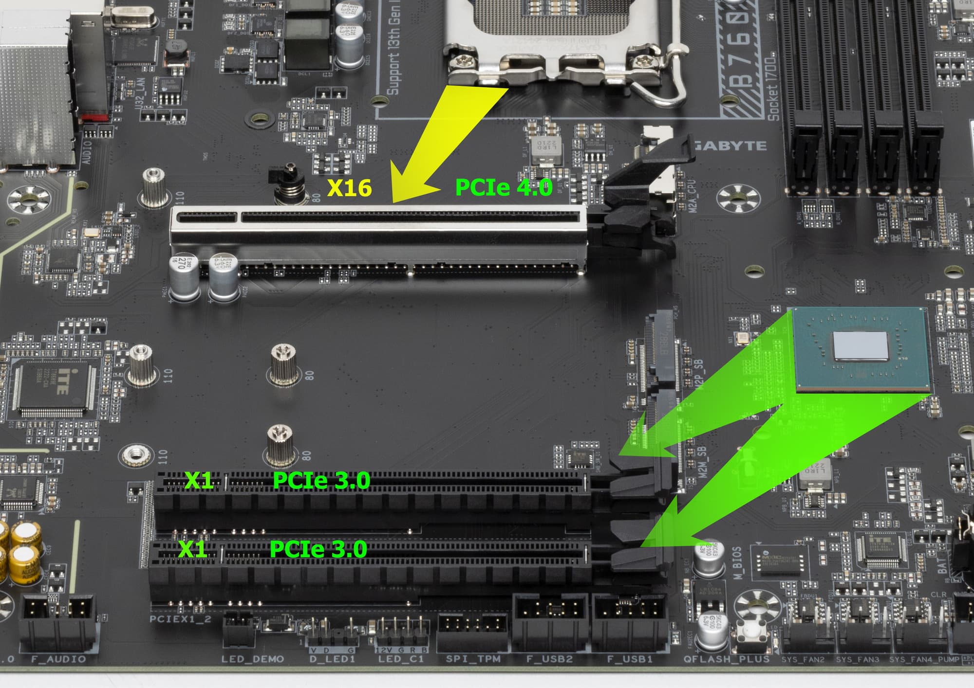 Выше я вел речь про первый PCIe x16_1, подключенный к процессору. Остальные два PCIe x16 подключены к B760, и, несмотря на их форм-фактор, работают в режимах x1.