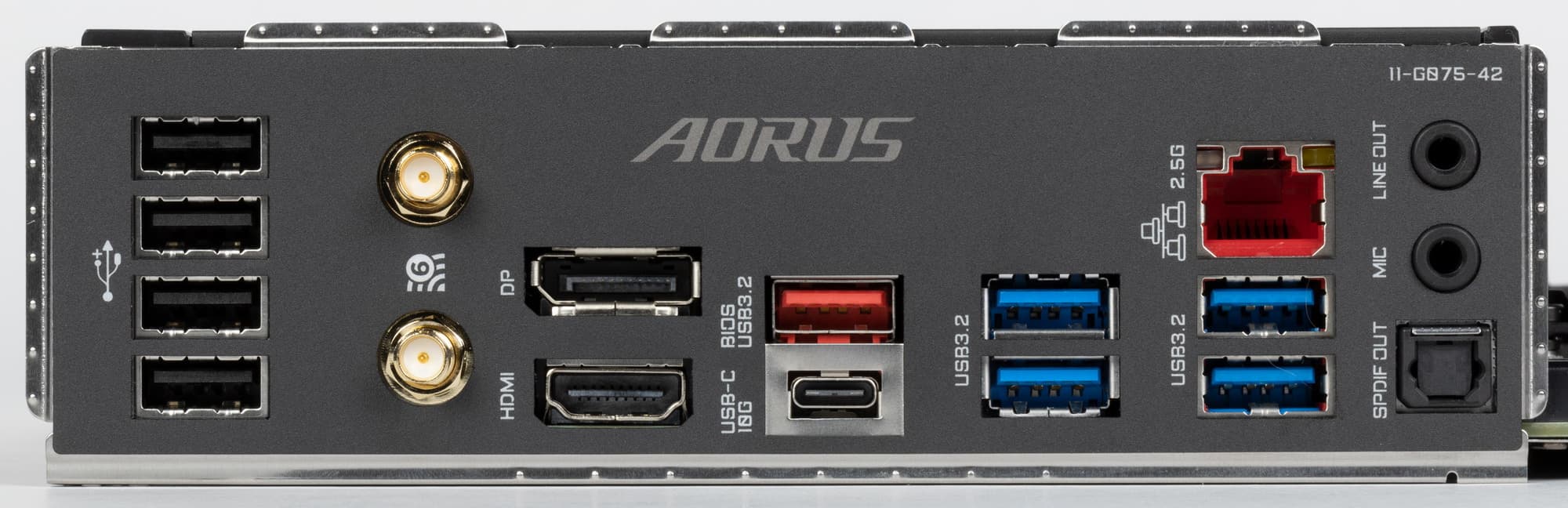 | Разъемы на задней панели | 1 × USB 3.2 Gen2 (Type-C) 1 × USB 3.2 Gen2 (Type-A) 4 × USB 3.2 Gen1 (Type-A) 4 × USB 2.0 (Type-A) 1 × RJ-45 2 аудиоразъема типа миниджек 1 × S/PDIF (оптический, выход) 1 × DP 1 × HDMI 2 антенных разъема |
