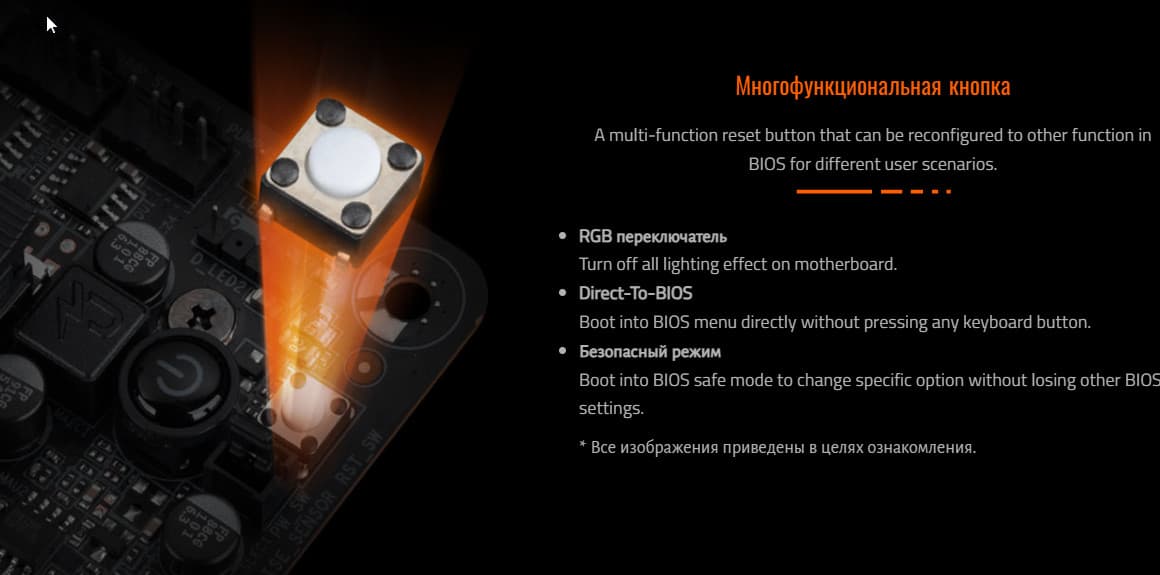 | Прочие внутренние элементы | 24-контактный разъем питания ATX 1 8-контактный разъем питания EPS12V 1 4-контактный разъем питания EPS12V 1 слот M.2 (E-key), занят адаптером беспроводных сетей 1 разъем для подключения порта USB 3.2 Gen2 Type-C 1 разъем для подключения 2 портов USB 3.2 Gen1 2 разъема для подключения 4 портов USB 2.0 6 разъемов для подключения 4-контактных вентиляторов и помп ЖСО 2 разъема для подключения неадресуемой RGB-ленты 2 разъема для подключения адресуемой ARGB-ленты 1 разъем аудио для передней панели корпуса 1 разъем сброса CMOS 1 разъем для устройств безопасности TPM 1 разъем для подключения управления с передней панели корпуса 1 кнопка перепрошивки BIOS — Q Flash Plus 1 кнопка перезагрузки Reset |
