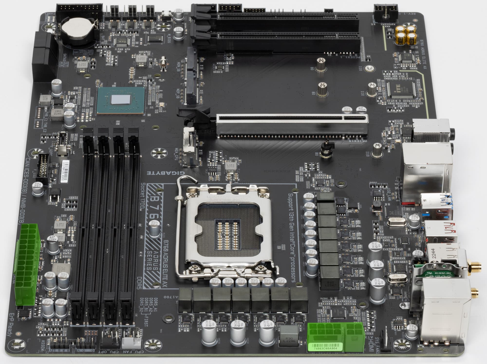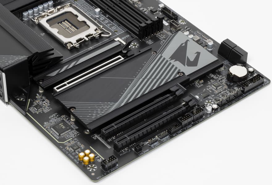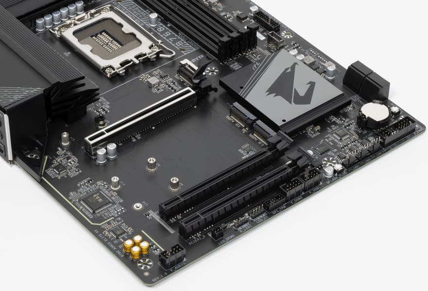 У Gigabyte B760 Aorus Elite AX имеется 17 портов USB разных видов, включая 3 очень быстрых USB 3.2 Gen2, а также 6 USB 3.2 Gen1. Плата предлагает 3 слота PCIe х16, один из которых получает от процессора 16 линий PCIe версии 4.0 (не 5.0, однако на сегодня это не играет никакой роли, так как видеокарт с поддержкой PCIe 5.0 пока на рынке нет), а два других работают в режиме x1 (подключены к B760). Также у платы 3 слота M.2: первый слот подключен напрямую к процессору линиями PCIe 4.0, два других слота М.2 подключены к чипсету B760 также линиями PCIe 4.0.