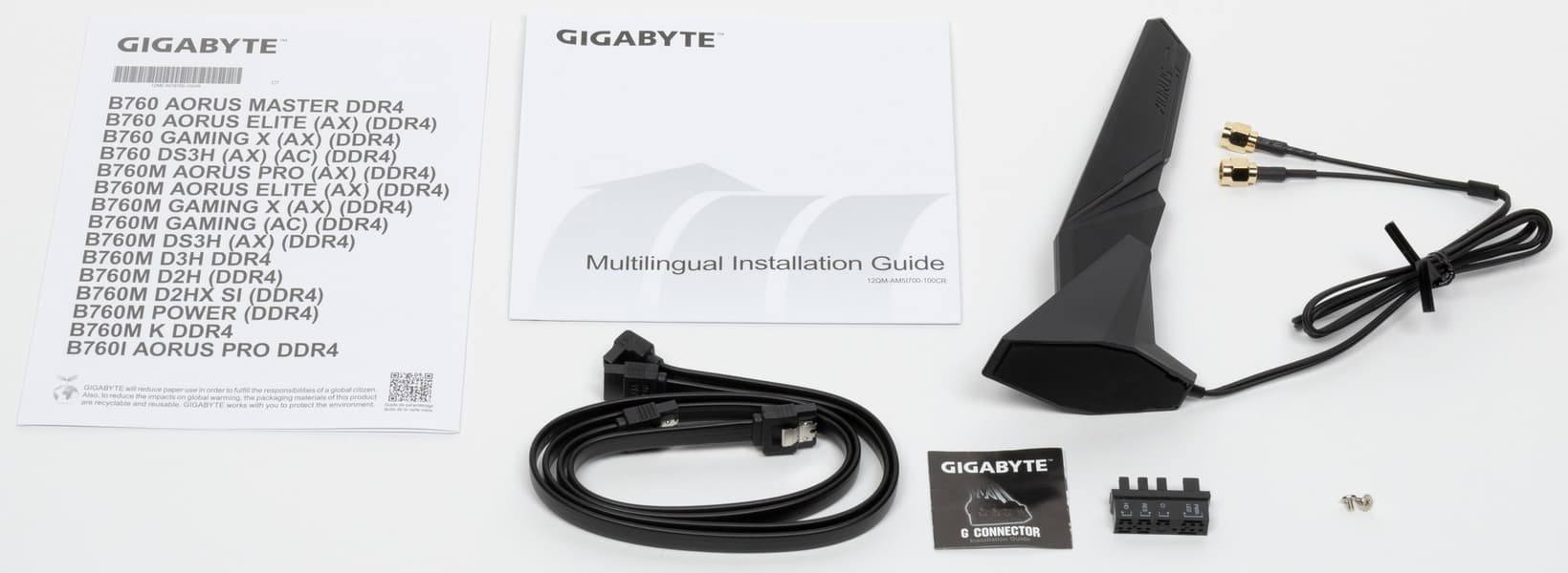 Комплект поставки очень скромен: кроме традиционных элементов типа руководства пользователя и кабелей SATA, имеются только антенна встроенного Wi-Fi-модуля, G-коннектор и винтики.