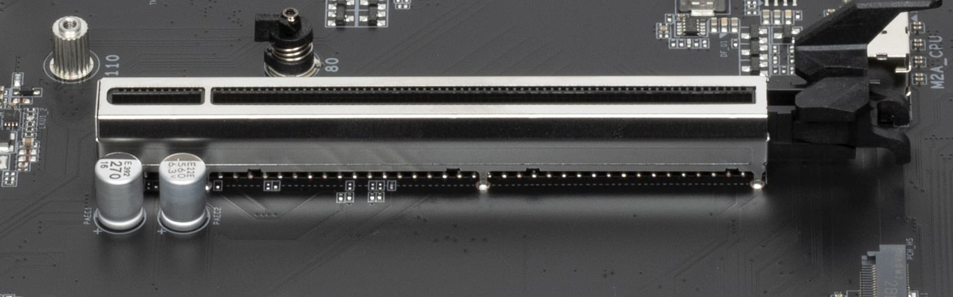 Как видим, перераспределений линий у первого PCIe x16_1 нет, поэтому и мультиплексоров нет. Версия PCIe тут понижена, скорее всего, ради удешевления самой материнки (не требуются дорогие ре-драйверы (усилители) сигнала PCIe 5.0)