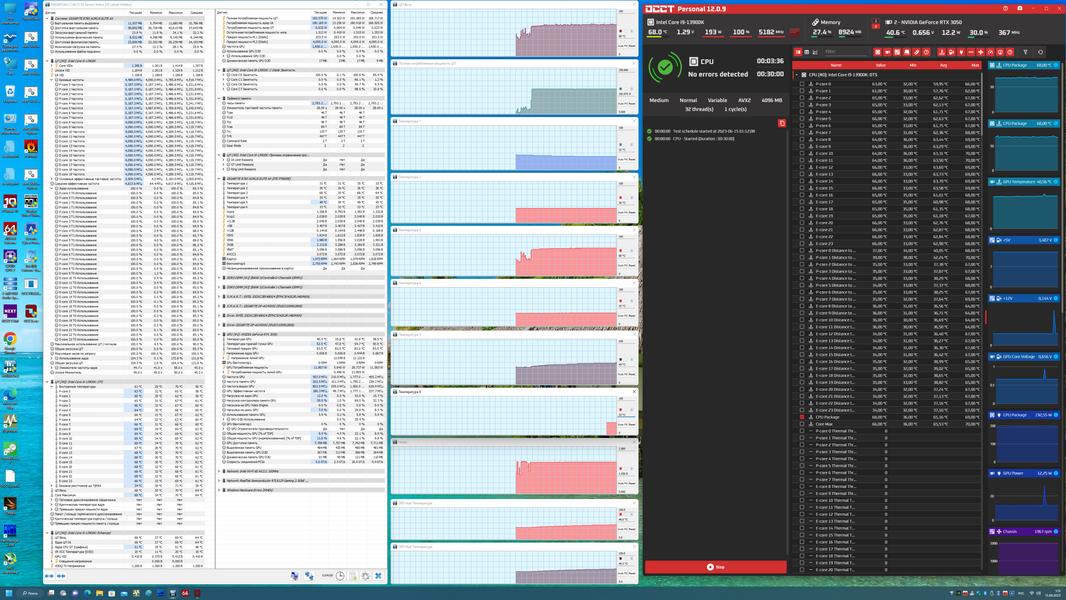 Скажу, что авторазгон не самый высокий, что мы видели ранее, но оно и логично: ведь система по умолчанию определяет возможности питания матплаты, а в данном случае система питания именно среднего уровня, так что уже напрашивается вывод, что подобные материнские платы явно не для самых топовых и требовательных процессоров, к которым относится Core i9-13900K. Что касается остальных параметров работы компонентов по нагреву, то все они были в норме (единственная проблема – инженеры Gigabyte как-то четко не обозначили – какой термодатчик за что отвечает и где установлен, поэтому программа HWiNFO не смогла их идентифицировать). Потребление CPU было чуть ниже 200 Вт.