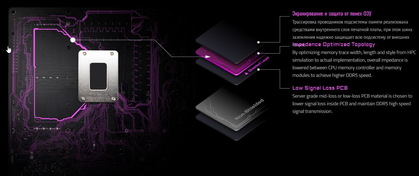 Плата поддерживает небуферизованную память DDR5 (non-EСС), а максимальный объем памяти составляет 192 ГБ (в случае использования модулей с объемом в 24/48 ГБ следует убедиться в последней версии прошивки BIOS).