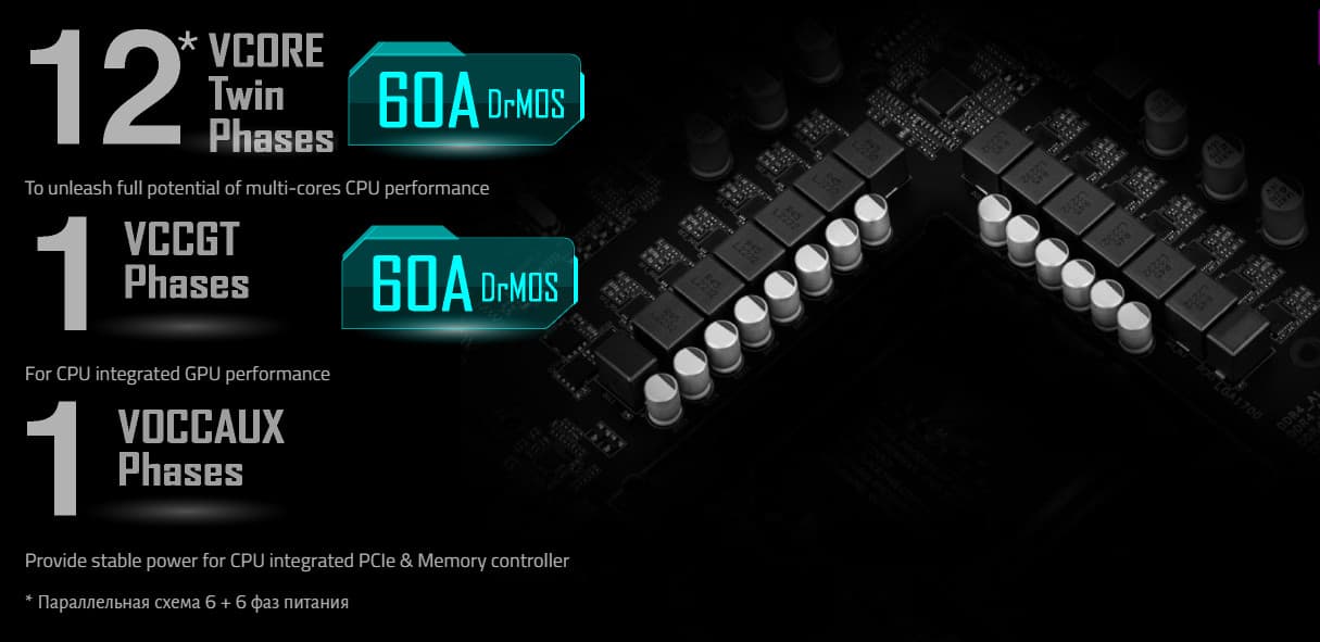 Управляет схемой ШИМ-контроллер NCP81530 от On Semi, он рассчитан максимум на 10 фаз.Поэтому фактически идет параллельная обработка 12-ти фаз питания VCore: 6+6, и в целом получается (6*2) VCore+1 iGPU = 7 фаз.