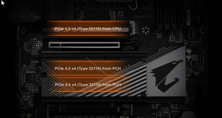 Все слоты работают с модулями только с PCIe интерфейсом, а также поддерживают модули с размерами 2280 и 22110.