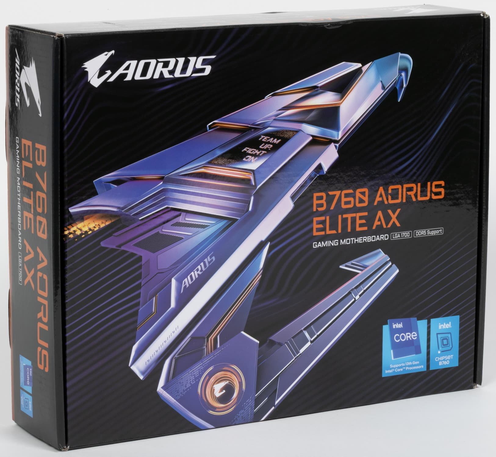 Gigabyte B760 Aorus Elite AX поставляется в стандартной коробке с фирменной раскраской. Комплект размещен под платой в отдельном отсеке.