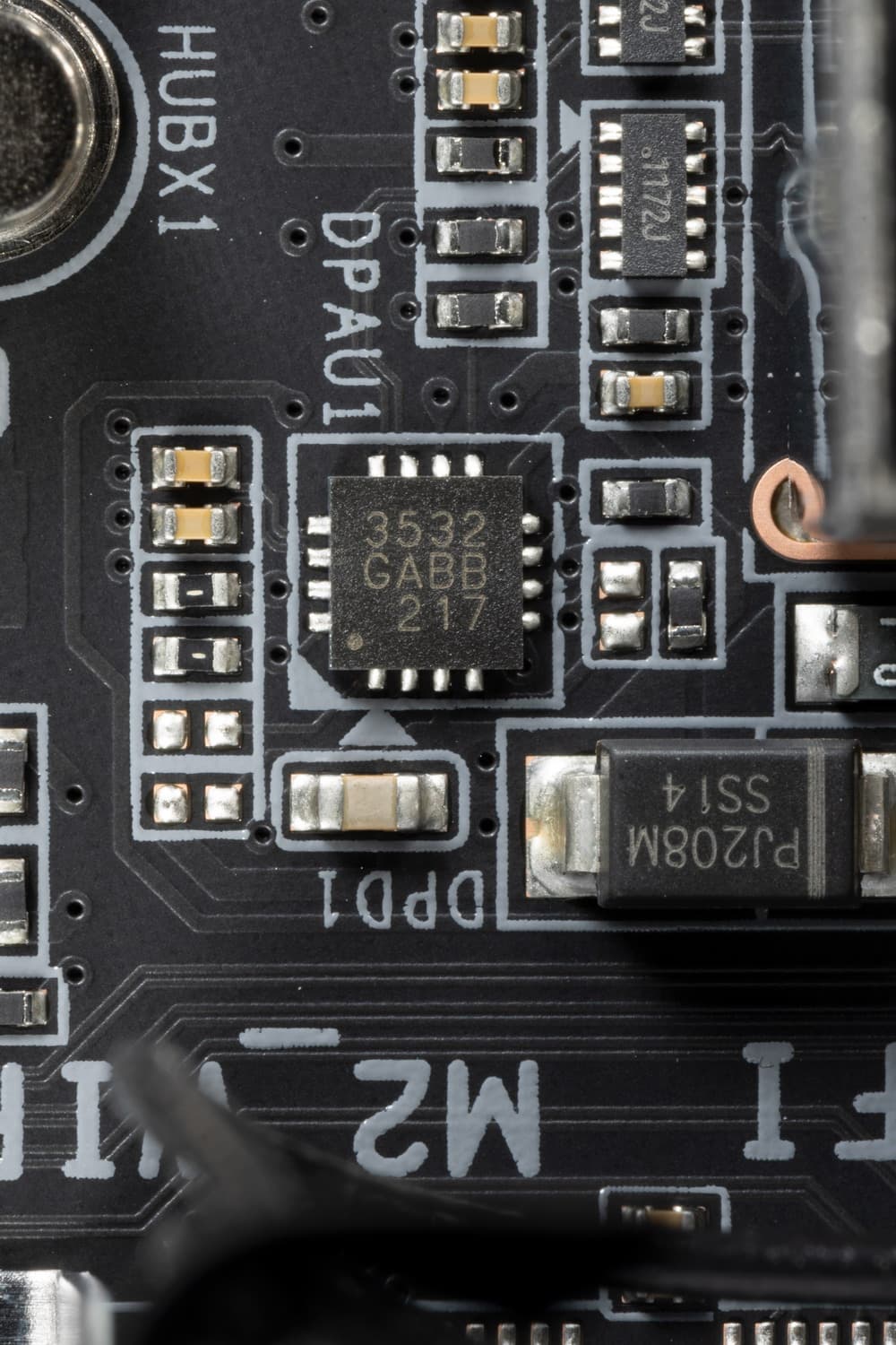 12 линий PCIe оказались занятыми (10 PCIe 4.0 + 2 PCIe 3.0) плюс 4 порта SATA. Связь с аудиокодеками уровня Realtek RTL408x идет через USB 2.0, а с кодеками уровня RTL1220 и ниже – через HDA (эмуляцию шины PCI), так что в данном случае линия USB 2.0 не расходуется. Но один USB 2.0 расходуется на поддержку BT, а также 2 контроллера GL850G и 1 контроллер RTS5411 для своих нужд используют сигнальные линии USB 2.0 Детально об этом ниже в разделе USB-портов.