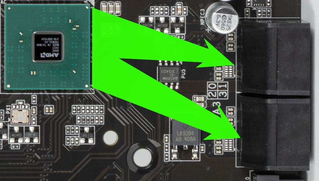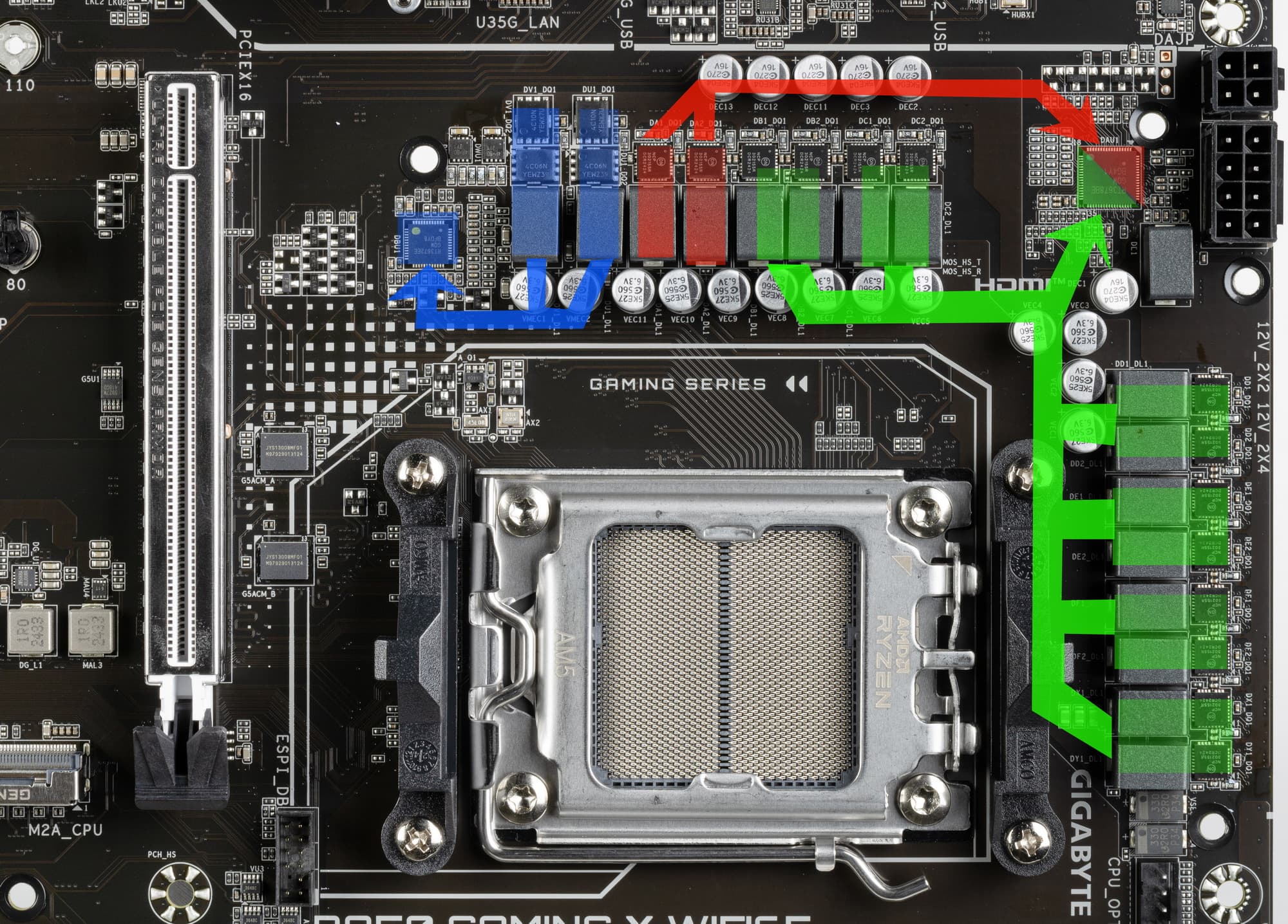 Внешне схема питания выглядит как 12+2+2: 12 фаз — ядро процессора, 2 фазы — SoC (I/O-чиплет Ryzen), 2 фазы — VDD_MISC (вывод встроенной графики).
