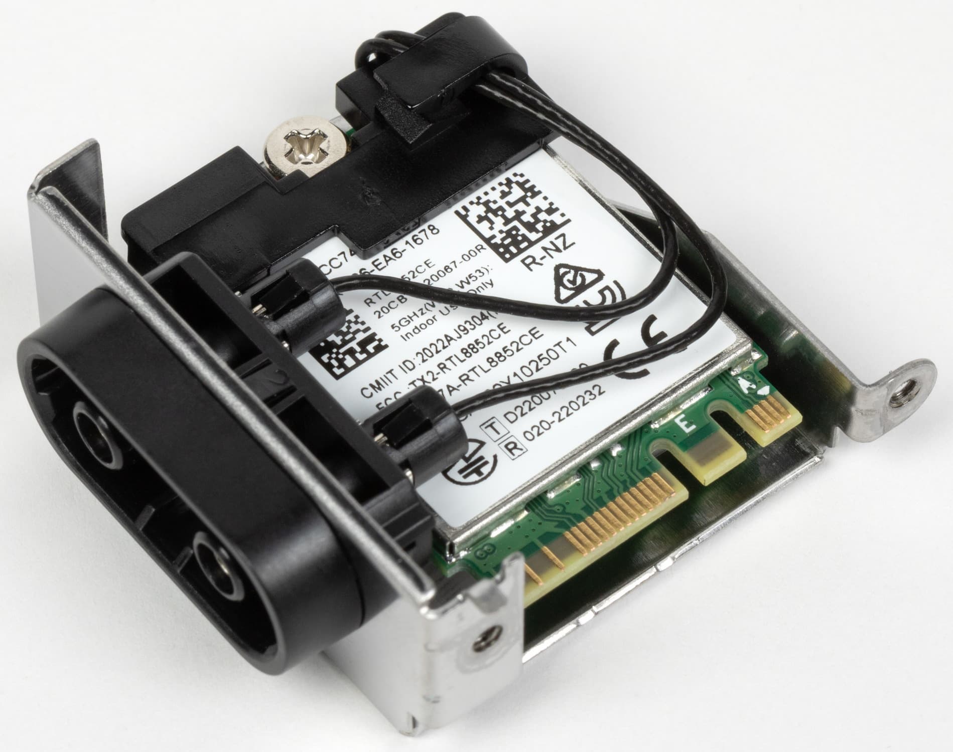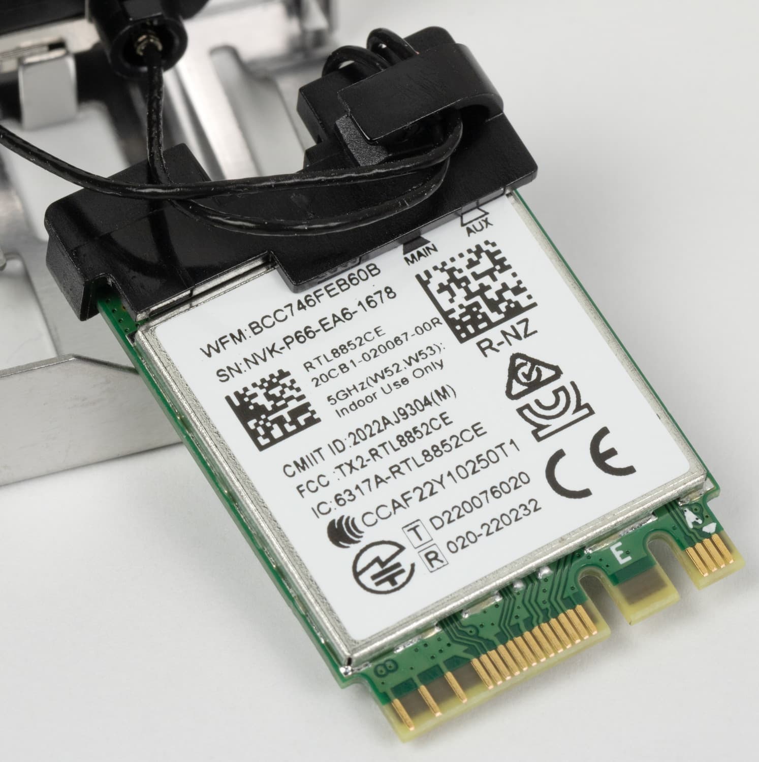 Имеется и комплексный беспроводной адаптер на контроллере Realtek RTL8852, через который реализованы Wi-Fi 6E (802.11a/b/g/n/ac/ax) и Bluetooth 5.3. Он установлен в слот M.2 (E-key), и его разъемы для присоединения выносных антенн выведены на заднюю панель.