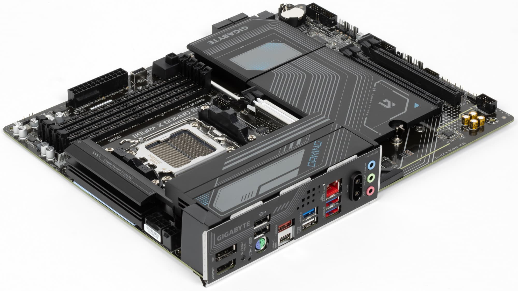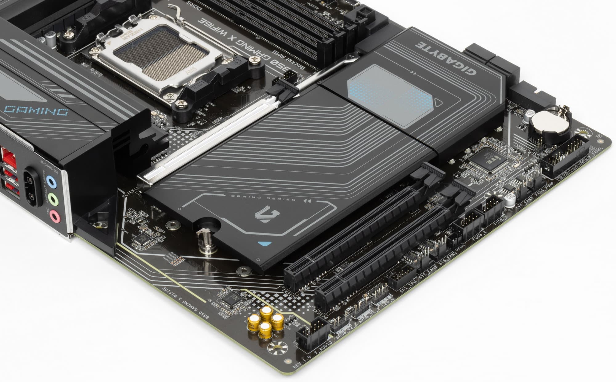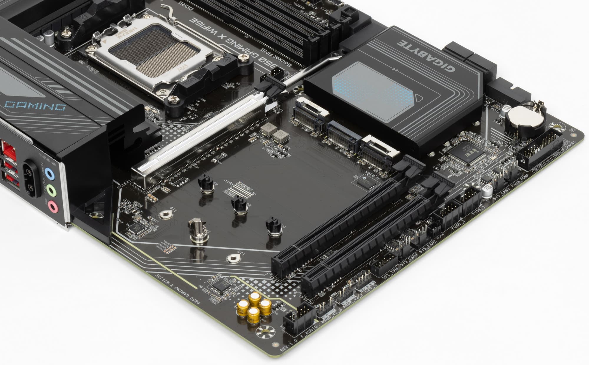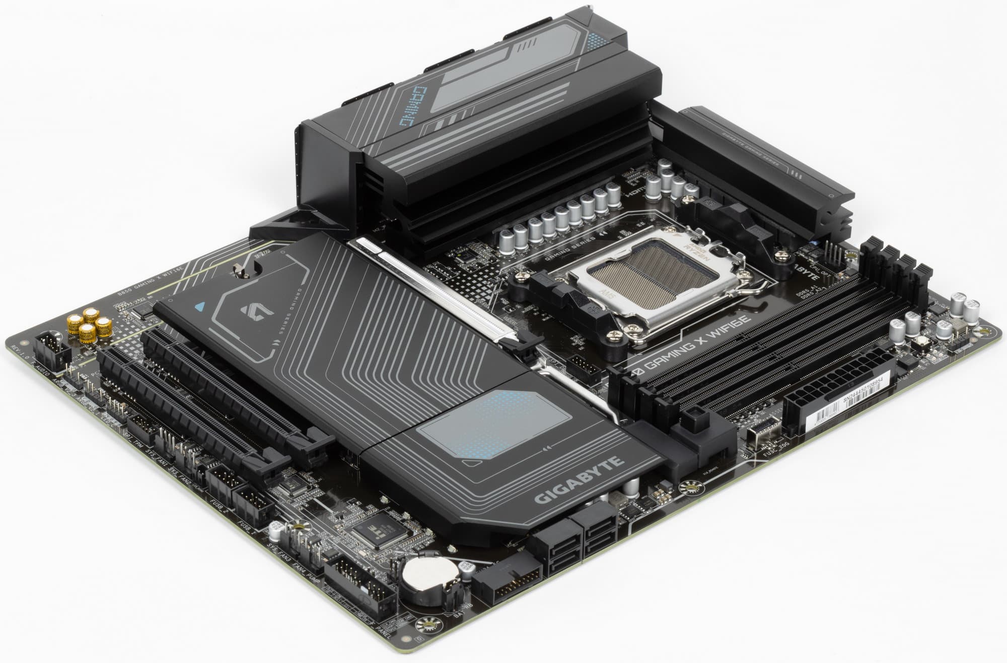 У Gigabyte B850 Gaming X WiFi6E имеется 15 портов USB разных видов, включая два быстрых порта USB 3.2 Gen2 и один USB 3.2 Gen2×2. Основной слот PCIe х16 получает от процессора 16 линий PCIe 5.0, возможно разделение линий через настройки в BIOS Setup (в случае установки накопителя в ближайший слот M.2). У платы имеется три слота M.2, один из которых поддерживает PCIe 5.0, остальные два — PCIe 4.0.