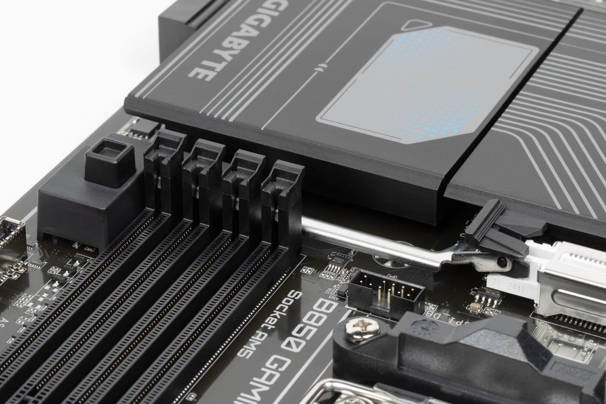 Для установки модулей памяти на плате имеется четыре DIMM-слота (для работы памяти в Dual Channel в случае использования всего 2 модулей их следует устанавливать в А2 и B2). Плата поддерживает небуферизованную память DDR5, а максимальный объем памяти составляет 256 ГБ. Поддерживаются профили XMP и Expo.