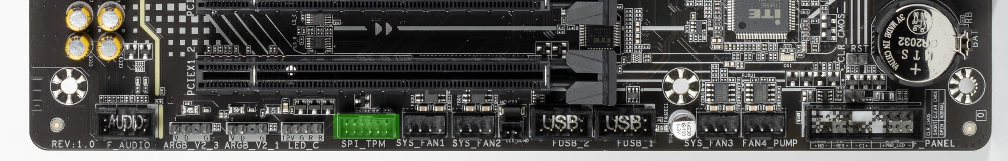 - 12 линий PCI-E 4.0 ( от чипсета и процессора), которые могут образовывать разные варианты комбинаций портов и слотов;