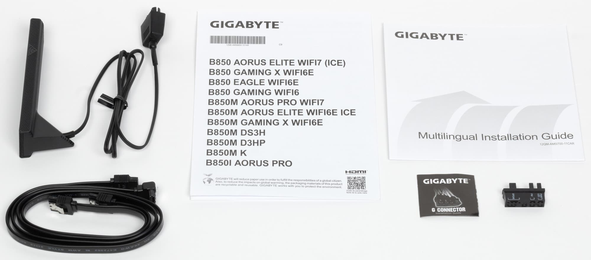 Gigabyte B850 Gaming X WiFi6E поставляется в традиционной из жесткого картона в фирменной черно-оранжевой цветовой гамме Gigabyte. Комплект размещен под платой в отдельном отсеке.