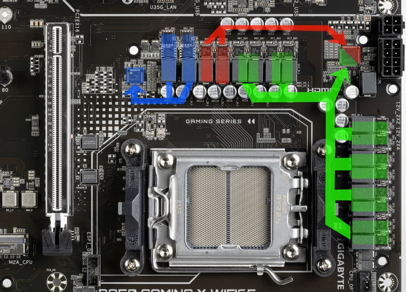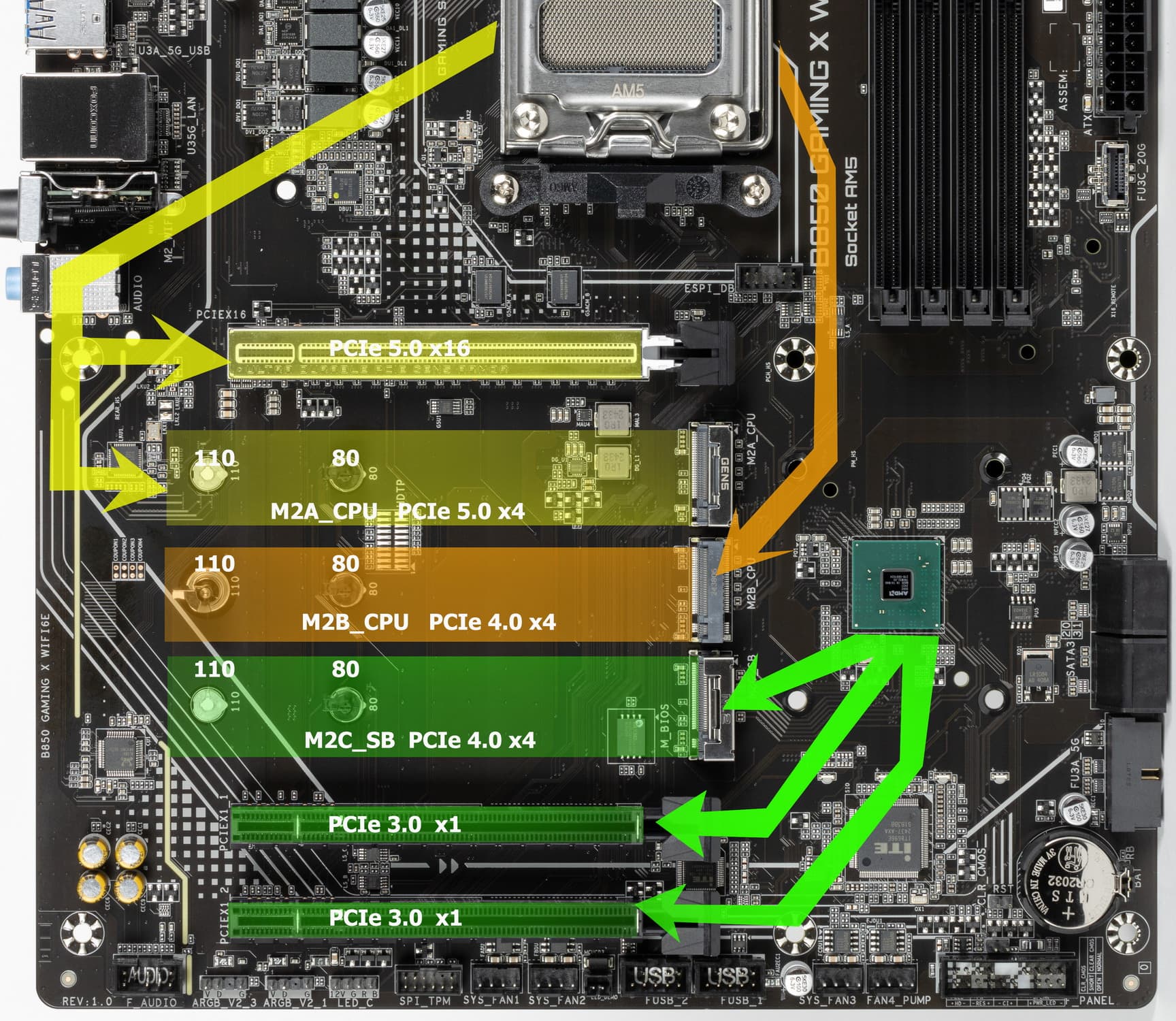 Выше приведена полная схема распределения ресурсов по слотам PCIe. Всего на плате есть 3 слота PCIe: один PCIe x16 PCIe 5.0, получающий данные от процессора, и два «длинных» слота, получающие данные от B850, но работающие по схеме x1 и x1.