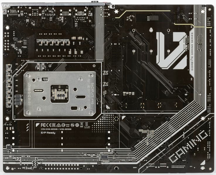 На оборотной стороне расположена металлическая пластина жесткости крепления процессорного разъема (сокета) и традиционная некоторая логика. Текстолит обработан хорошо: во всех точках пайки острые концы срезаны,а также отшлифовано. Защитной пластины (бэкплейта) нет.