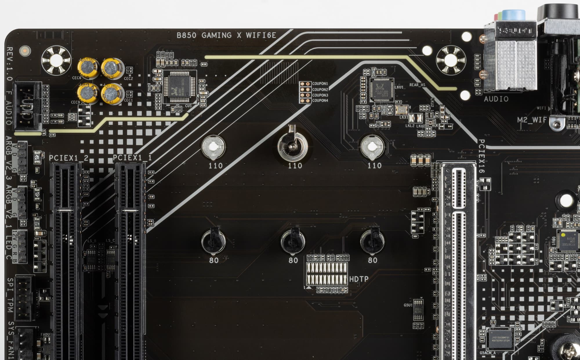 Все 3 слота поддерживают размеры модулей 25110/2580/22110/2280 и работают с модулями только с PCIe интерфейсом, при этом два (M2A_CPU, M2B_CPU) из них получают данные от CPU, а один M2C_SB – от чипсета B850.