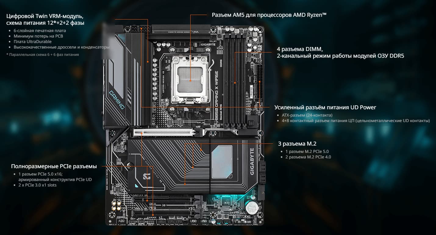| Поддерживаемые процессоры | AMD Ryzen 7xxx/8xxx/9xxx под AM5 |