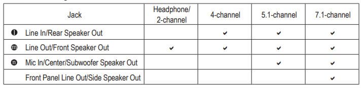 Аудиотракт вынесен на угловую часть платы, не пересекается с другими элементами. У карты три стандартных разъема по приему и выводу сигналов с традиционной раскраской. Вывод по схемам 5.1/7.1 показан ниже.