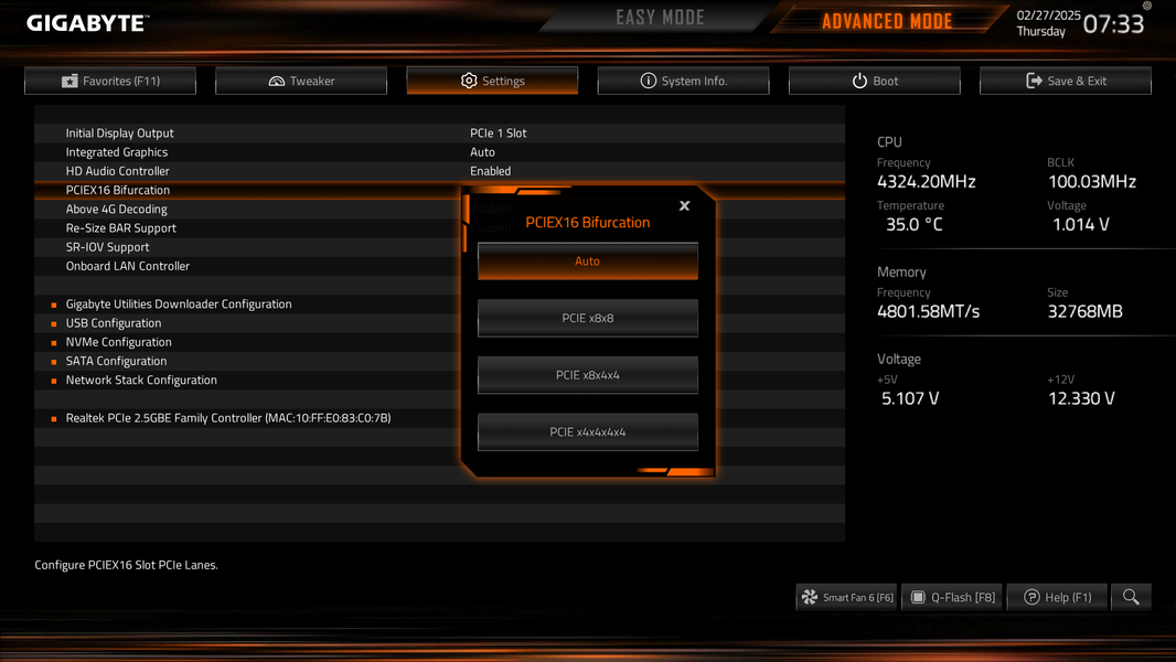 Напомню, что чипсет B850 имеет тот же набор портов и линий PCIe, что и B650, плюс возможность разделения 16 PCIe 5.0 линий от процессора на 8 + 8.