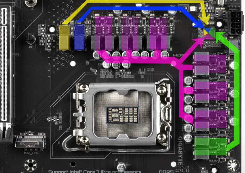 Схема питания процессора выполнена по схеме 12+2+1+1 (всего 16 фаз: 12 на VCore (ядро процессора), 1 на iGPU (интегрированное графическое ядро), 2 на VCCSA (System Agent, кольцевая шина) и 1 на VNNAON (управление энергосбережением).